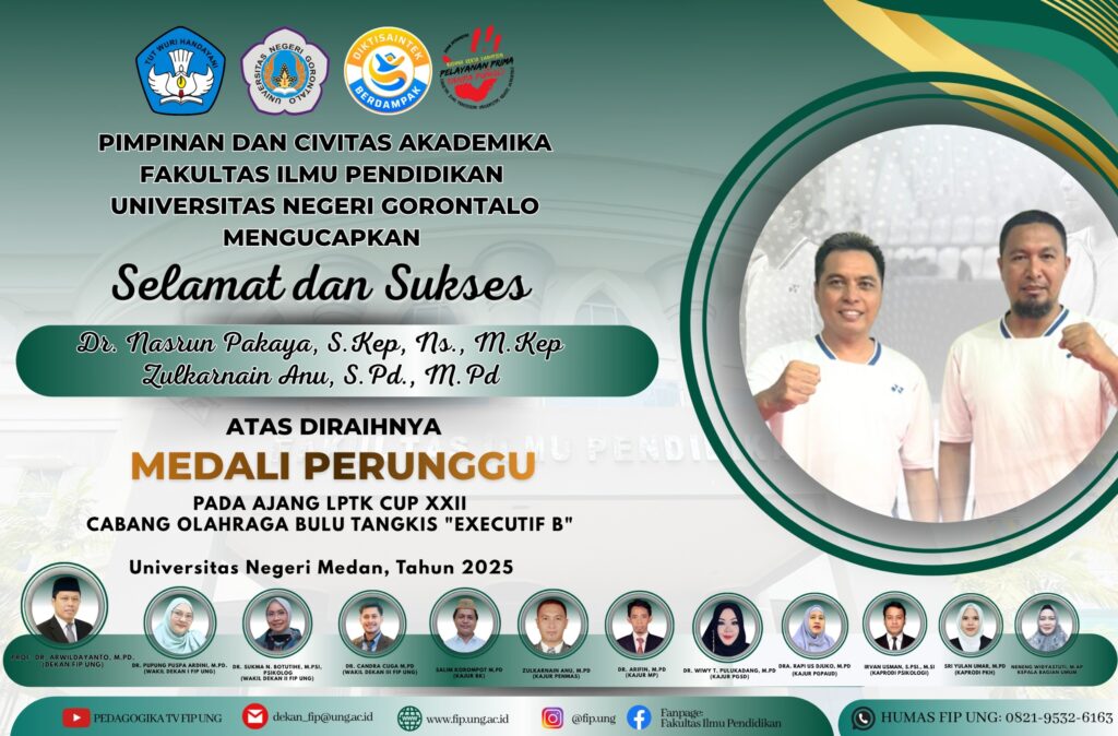 FIP UNG-Universitas Negeri Gorontalo (UNG) kembali menunjukkan prestasinya pada ajang LPTK Cup XXII–2025 yang digelar pada 13–16 November 2025 di Universitas Negeri Medan, Sumatera Utara. Pada kompetisi bergengsi antar-Lembaga Pendidikan Tenaga Kependidikan (LPTK) se-Indonesia tersebut, UNG berhasil menempati peringkat ke-4 pada klasemen akhir perolehan medali. UNG mencatatkan total 6 medali, terdiri atas 1 medali emas, […]