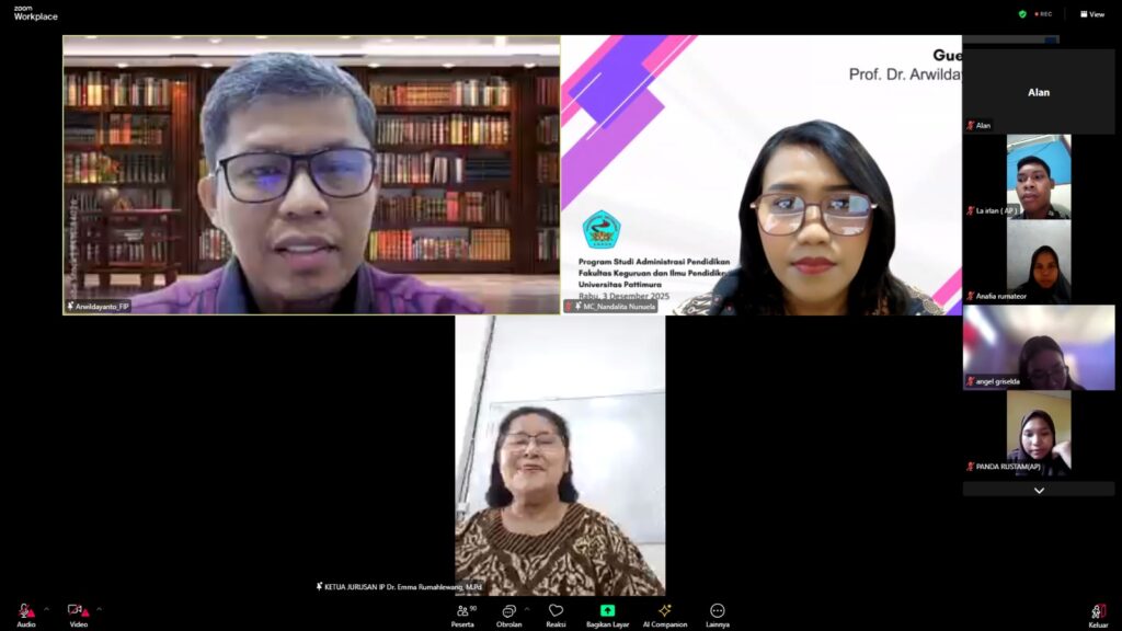 FIP UNG – Program Studi Administrasi Pendidikan, Fakultas Keguruan dan Ilmu Pendidikan (FKIP) Universitas Pattimura menyelenggarakan kegiatan Kuliah Tamu Tahun 2025 secara virtual melalui aplikasi Zoom Meetings pada Rabu, 3 Desember 2025 pukul 10.00 WIT. Kegiatan ini diikuti oleh mahasiswa Program Sarjana (S1), Magister (S2), dan Doktor (S3) Universitas Pattimura. Hadir dalam kegiatan tersebut Ketua […]