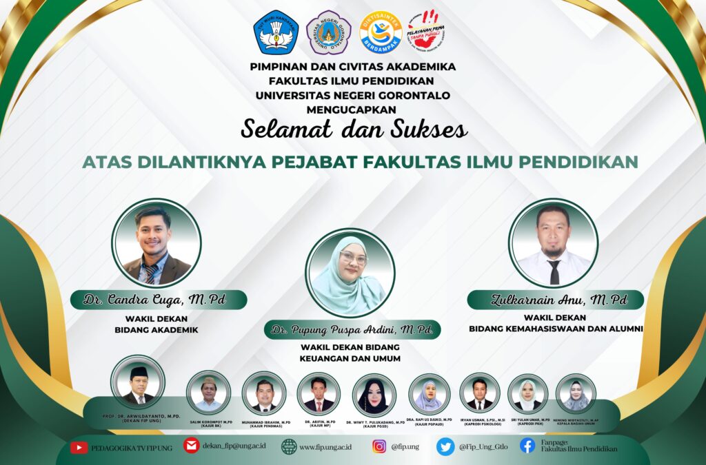 FIP UNG — Universitas Negeri Gorontalo (UNG) melalui Fakultas Ilmu Pendidikan (FIP) resmi melaksanakan Pelantikan dan Pengambilan Sumpah Jabatan Wakil Dekan dan Ketua Jurusan pada Senin, 1 Desember 2025, bertempat di Lantai 1 Gedung Rektorat UNG. Kegiatan yang dimulai pada pukul 15.30 WITA tersebut berlangsung khidmat dan dihadiri oleh pimpinan fakultas, dosen, serta civitas akademika […]