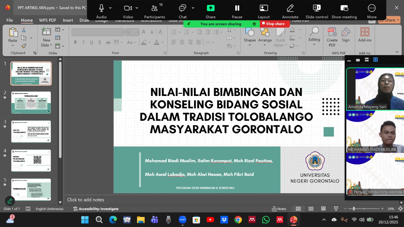Keberhasilan ini tidak lepas dari pendampingan dosen-dosen muda Program Studi Bimbingan dan Konseling, yakni Mohamad Awal Lakadjo, M.Pd., Permata Sari, S.Pd., M.Pd., Dr. Ilham Khairi Siregar, M.Pd., dan Jumadi Mori Salam Tuasikal, S.Pd., M.Pd., serta dukungan penuh dari Jurusan Bimbingan dan Konseling dan Fakultas Ilmu Pendidikan UNG.