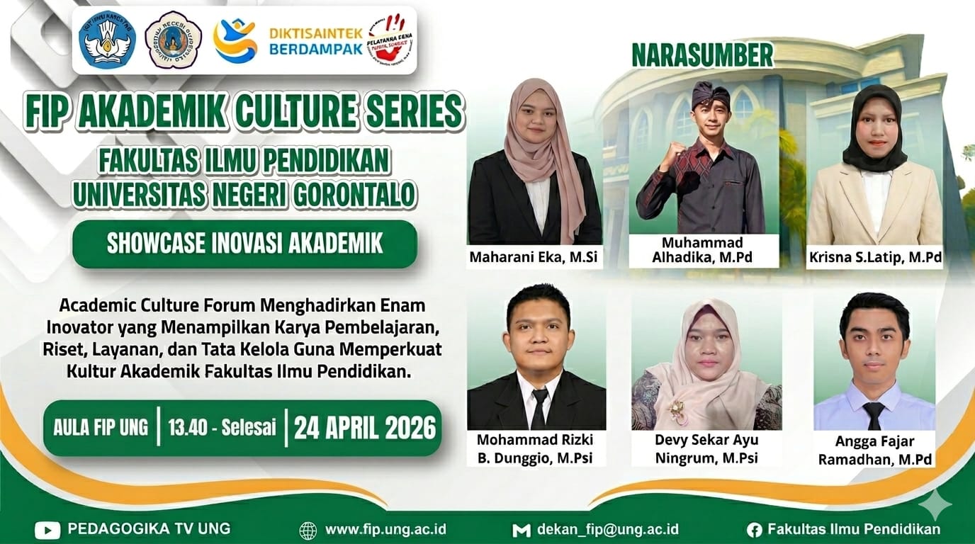 FIP UNG – Fakultas Ilmu Pendidikan Universitas Negeri Gorontalo kembali menunjukkan komitmennya dalam memperkuat budaya akademik melalui penyelenggaraan FIP Akademik Culture Series dengan tema Showcase Inovasi Akademik. Kegiatan yang berlangsung di Aula FIP UNG pada 24 April 2026 ini menghadirkan enam inovator dosen yang mempresentasikan berbagai karya di bidang pembelajaran, riset, layanan, dan tata kelola.