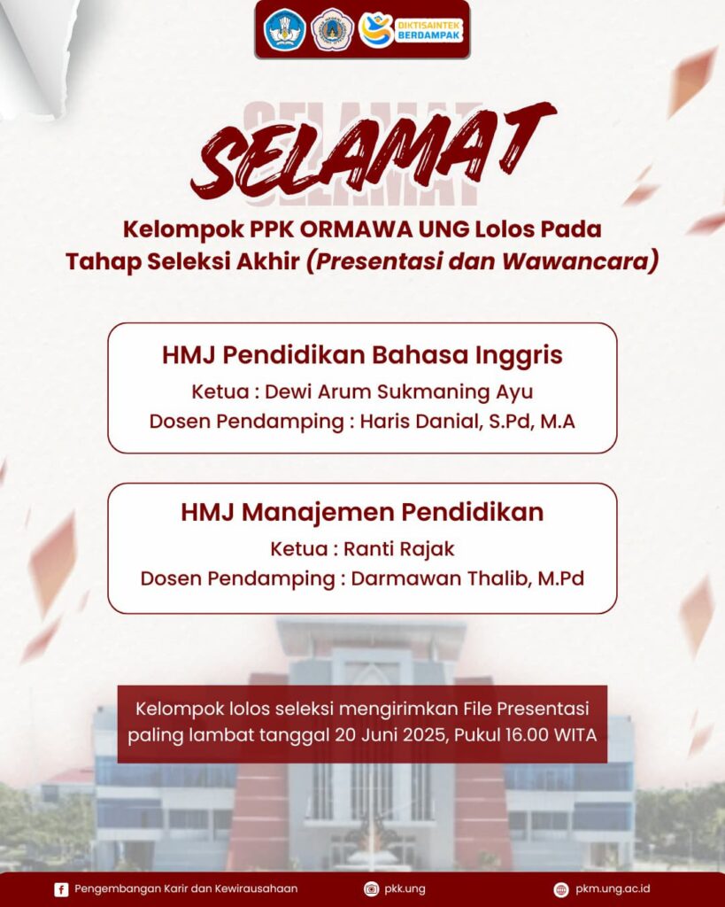 Salah satu yang lolos adalah proposal unggulan dari HMJ Manajemen Pendidikan FIP UNG, menjadikan mereka sebagai wakil dari FIP UNG dalam ajang nasional bergengsi ini.