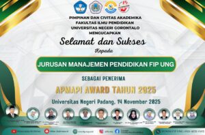 FIP UNG — Jurusan Manajemen Pendidikan, Fakultas Ilmu Pendidikan, Universitas Negeri Gorontalo (UNG) meraih APMAPI Award 2025 untuk kategori “Prodi berprestasi unggul dalam tridarma perguruan tinggi, berkomitmen, loyalitas tinggi pada organisasi, dan aktif pada kegiatan APMAPI seluruh Indonesia.”