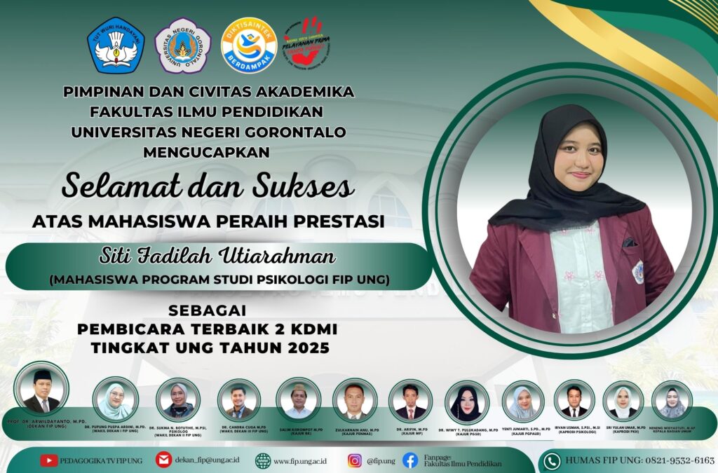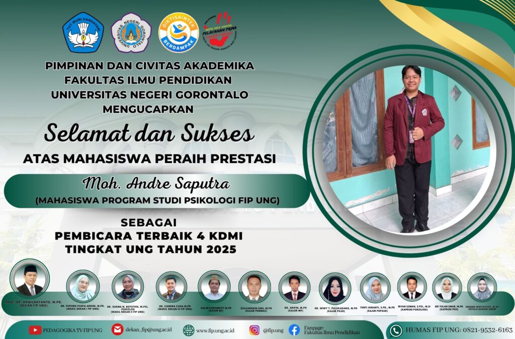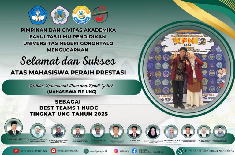 fip.ung.ac.id,Gorontalo–Mahasiswa Program Studi PGSD, PG-PAUD dan Psikologi Fakultas Ilmu Pendidikan Universitas Negeri Gorontalo (FIP UNG) kembali mengukir prestasi membanggakan di Universitas. Rendi Gobel dan Arthika Rahmawati Ilam berhasil meraih best team 1 NUDC tingkat Universitas Negeri Gorontalo 2025, Siti Fadila Utiarahman berhasil menjadi pembicara terbaik 2 dan Mohamad Andre Saputra pembicara terbaik 4 KDMI tingkat Universitas Negeri Gorontalo 2025.