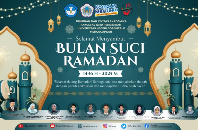 Pimpinan dan Civitas Akademika Fakultas Ilmu Pendidikan Universitas Negeri Gorontalo Mengucapkan Selamat Menyambut Bulan Suci Ramadhan 1446 H-2025 M. “Selamat Datang Ramadhan ! Semoga Kita Bisa Menjalankan Ibadah dengan penuh keikhlasan dan mendapatkan ridha Allah SWT”