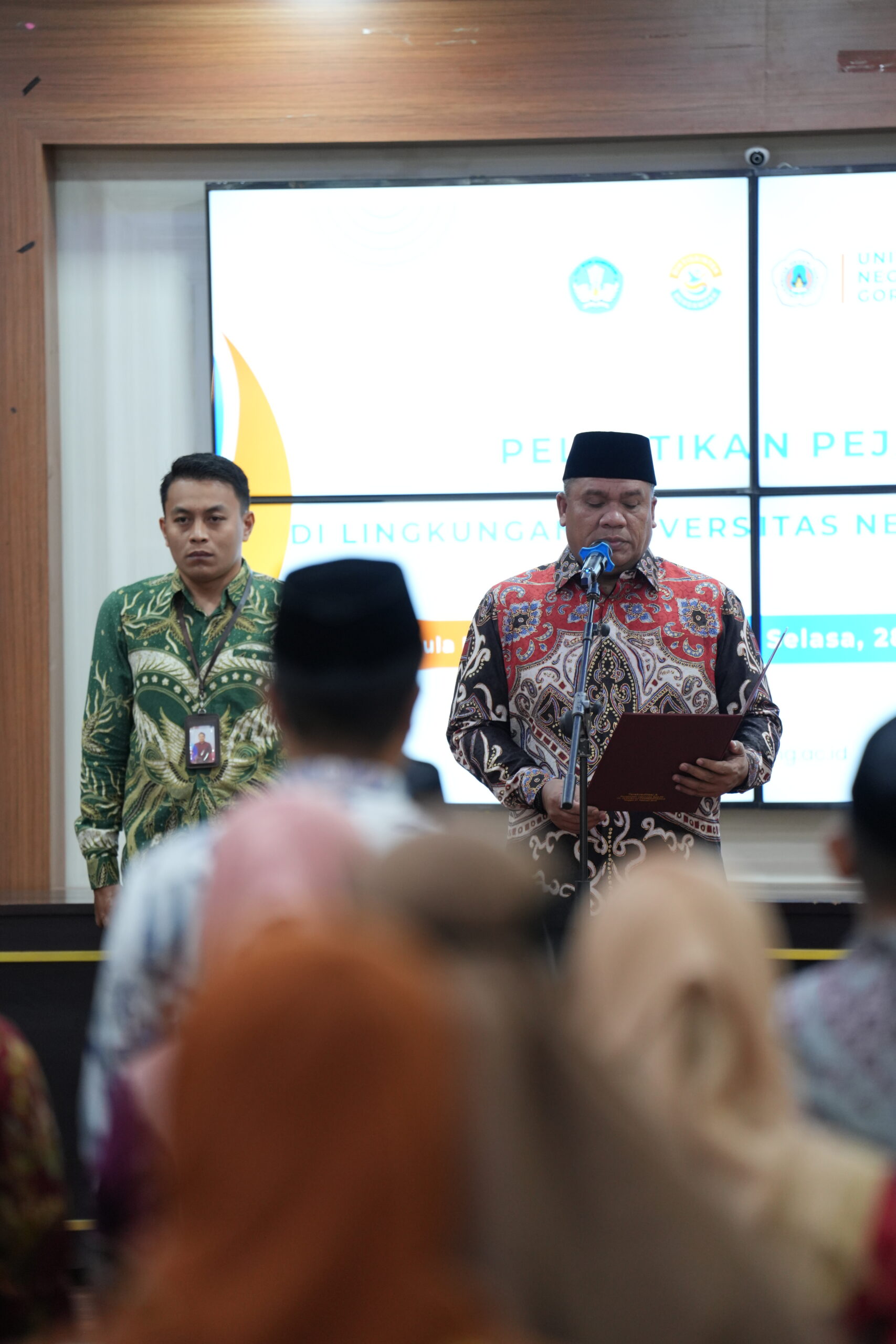 FIP UNG – Universitas Negeri Gorontalo (UNG) melaksanakan Pelantikan Jabatan Pejabat di lingkungan Universitas pada Selasa, 28 Oktober 2025 pukul 08.30 WITA, bertempat di Aula Prof. Kadir Abdussamad, Fakultas Ekonomi dan Bisnis UNG. Sebanyak 62 pejabat baru resmi dilantik dalam kegiatan tersebut.