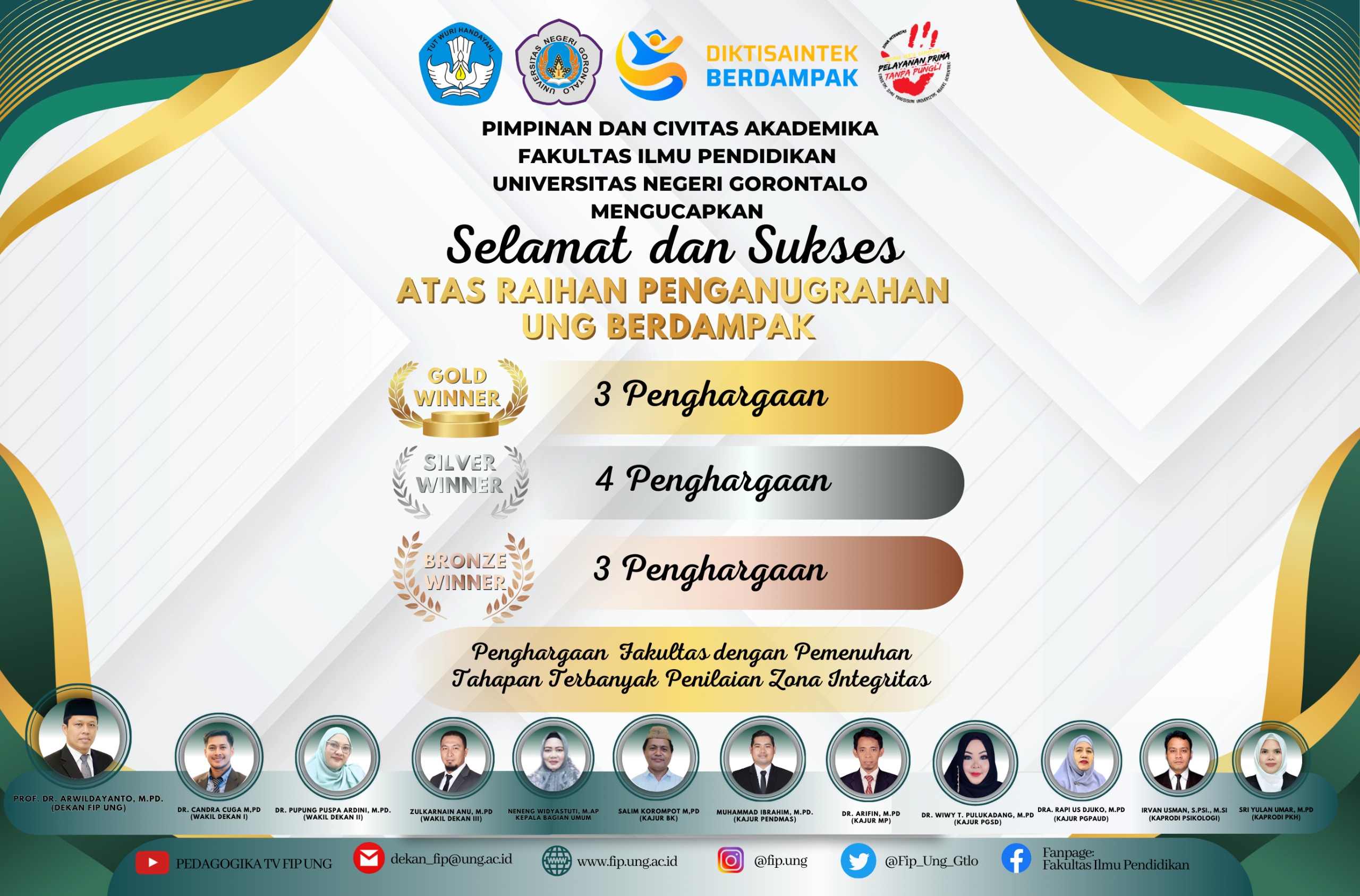 Dalam ajang penghargaan tersebut, Fakultas Ilmu Pendidikan (FIP) UNG berhasil menorehkan prestasi membanggakan dengan meraih Gold Winner pada kategori Fakultas dengan Dokumentasi Kerja Sama Terbanyak. Penghargaan ini menjadi bukti nyata atas keseriusan FIP UNG dalam membangun, mengelola, dan mendokumentasikan jejaring kolaborasi secara berkelanjutan.