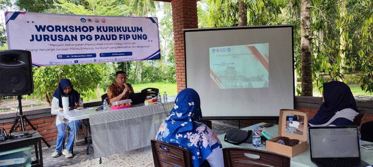 FIP UNG — Jurusan Pendidikan Guru Pendidikan Anak Usia Dini (PGPAUD) Fakultas Ilmu Pendidikan Universitas Negeri Gorontalo menyelenggarakan Workshop Kurikulum pada 15–16 November 2025 bertempat di Villa Lonua, Gorontalo. Kegiatan bertajuk “Menjalin Kehangatan Mewujudkan Inovasi Unggul Keilmuan: Sinergi Keluarga Jurusan PGPAUD Menuju Kurikulum yang Berkualitas dan Berdampak” ini diikuti oleh para dosen, tenaga kependidikan, dan sivitas akademika PGPAUD.